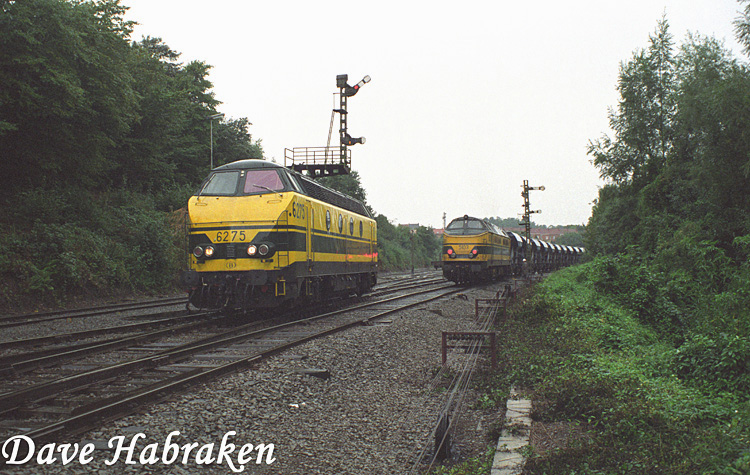 Direct na binnenkomst van de 5103 mag de 6275 los terug naar Tubize rijden. Let eens op het kleurverschil met de donkerdere 5103, toch wel opmerkelijk of niet soms? De katrol rechts onderaan in beeld is een ingenieus truucje uit de mechanische seingeving om één sein door twee mogelijke handels in het seinhuis te kunnen laten bedienen. Dit had dan weer alles te maken met het feit dat iedere reisweg in principe zijn eigen handel had. Uiteraard moest er dan ergens een overgang zijn van 2 paar trekdraden, afkomstig van de handels, naar één paar trekdraden naar het sein toe.