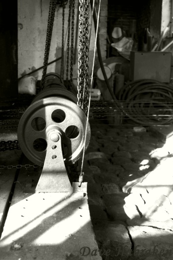 Zo'n oud seinhuis vraagt om sfeerfoto's. Als de zon dan wat meewerkt zoals hier op 6 oktober 2005 smeekt dit om een sfeerfotootje van enkele katrollen die de trekdraden naar buiten leiden.