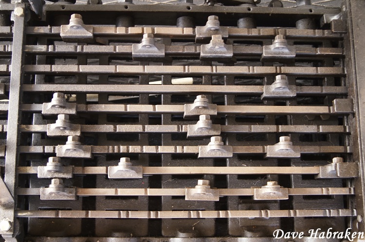 Op de nieuwste seinhuizen is het een computerprogramma dat beslist of een sein al dan niet in de stand veilig mag komen. In Neerpelt wordt dit volledig mechanische geregeld met dit stelsel van roosters, nokken en linialen. Als iemand nu een hendel wil omleggen, gebeurt dit samen met het draaien van een bijhorend rooster (onderaan zichtbaar). Elke hendel zit echter ook aan een liniaal met nokken vast. Als een nok van een andere hendel de te bedienen hendel plus rooster blokkeert, kan de seingever de hendel dus niet omleggen en het sein niet bedienen. Simpel, maar oerdegelijk!